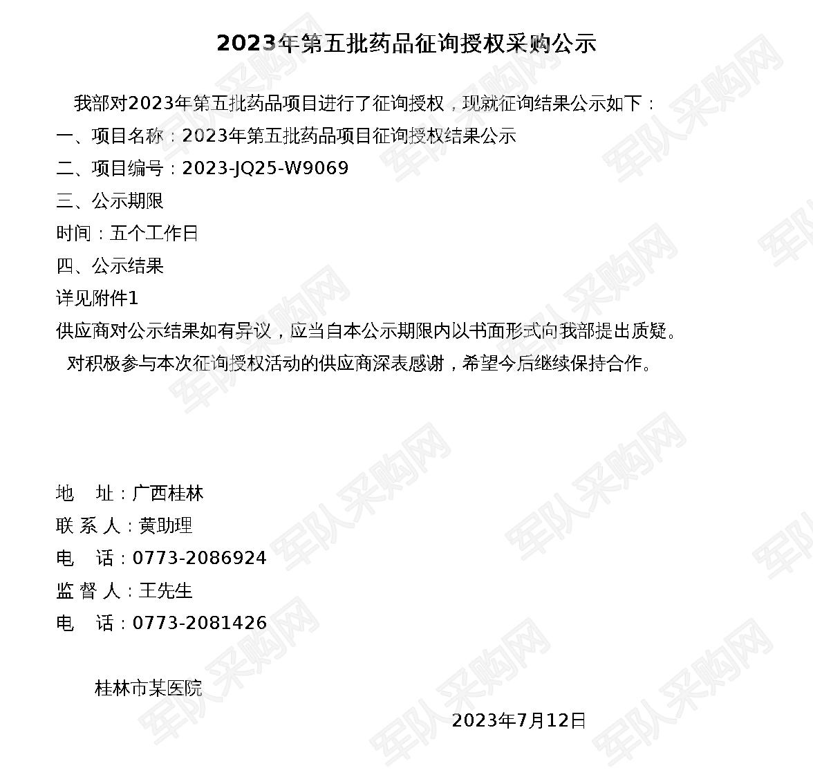【军队采购】军队采购网2023年第五批药品征询授权采购公示(2023-JQ25-W9069)