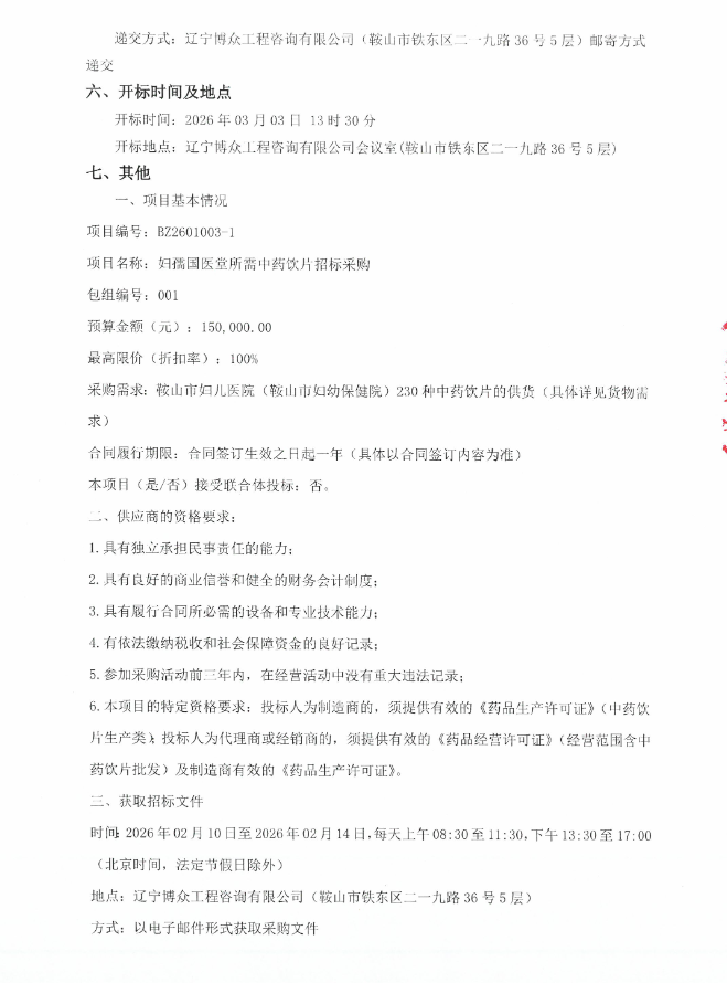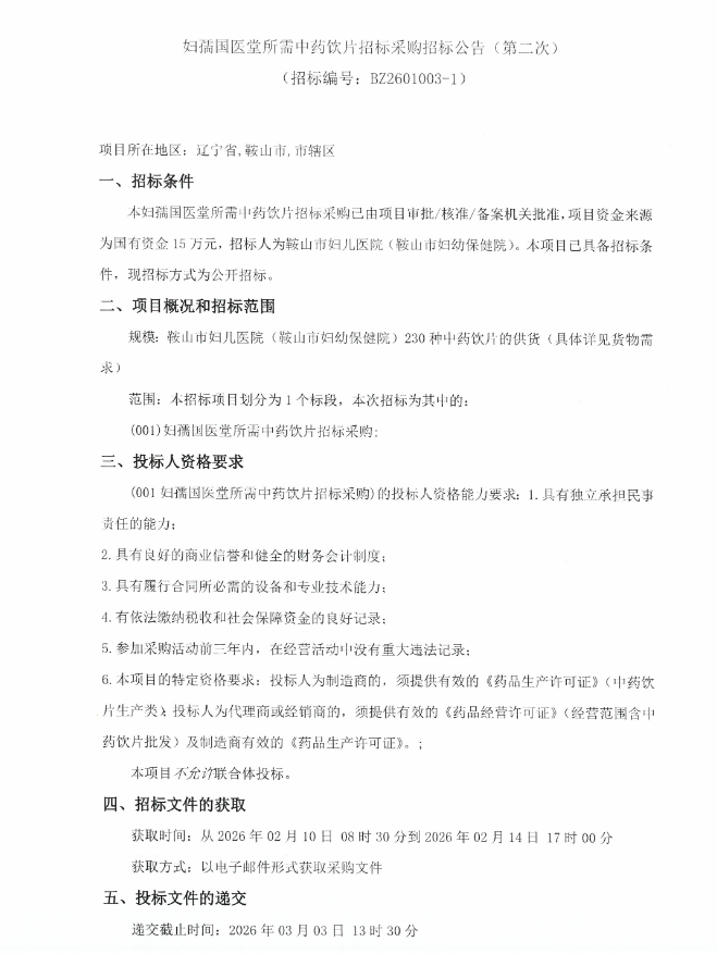 【鞍山市妇儿医院】辽宁省鞍山市妇孺国医堂所需中药饮片招标采购招标公告(第二次)
