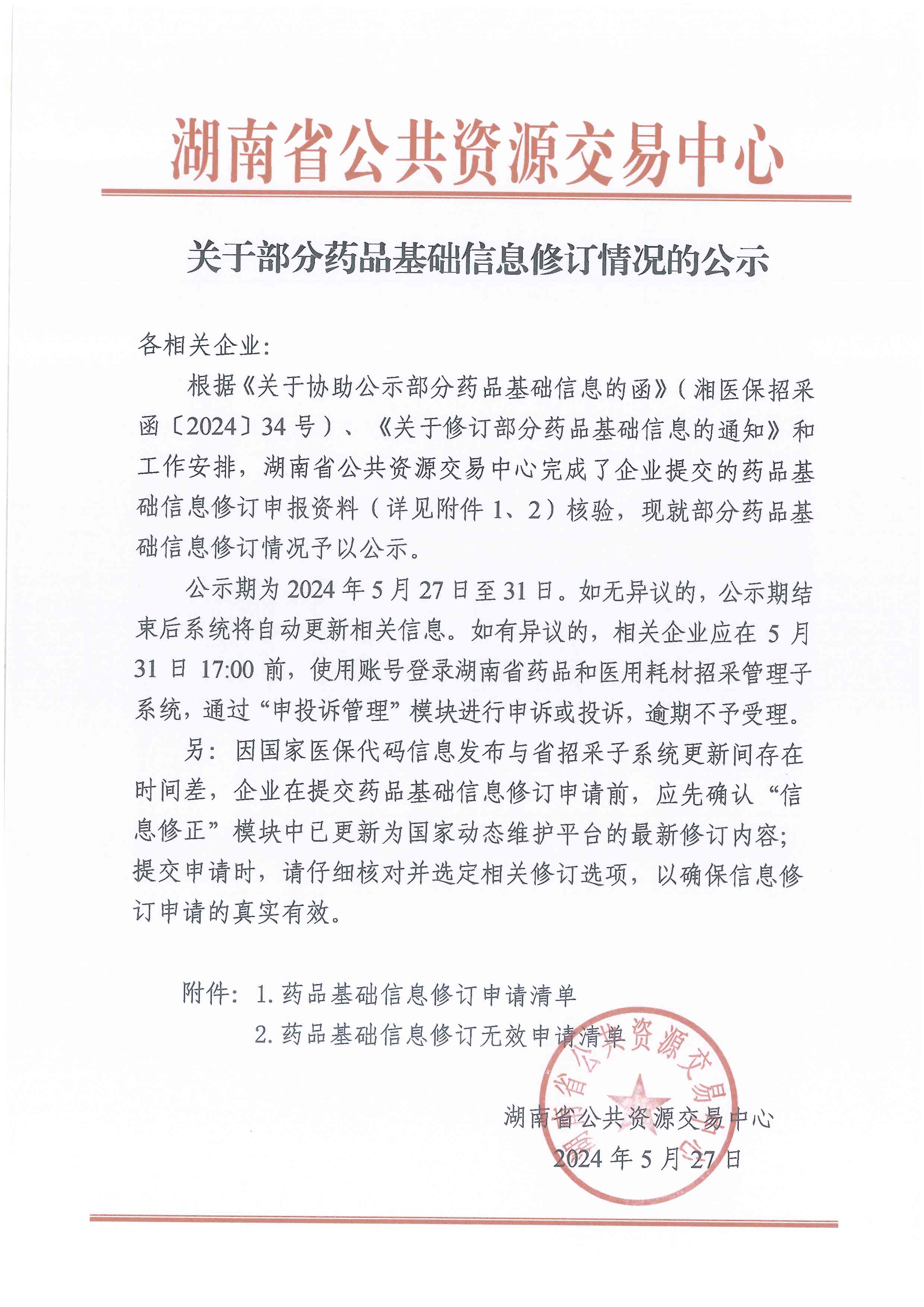 根据《关于协助公示部分药品基础信息的函》(湘医保招采函〔2024〕34号)、《关于修订部分药品基础信息的通知》和工作安排,湖南省公共资源交易中心完成了企业提交的药品基础信息修订申报资料(详见附件1、2)核验,现就部分药品基础信息修订情况予以公示。