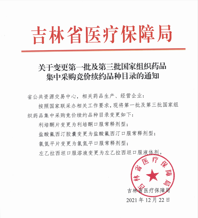 【吉林】吉林省关于变更第一批及第三批国家组织药品集中采购竞价续约品种目录的通知