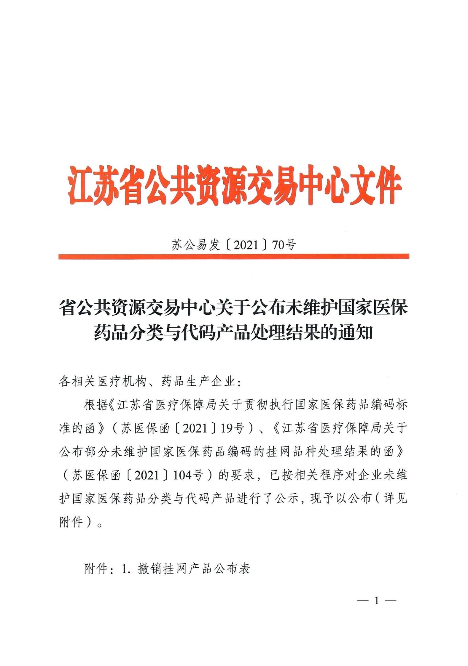 【江苏】2021年江苏省公共资源交易中心关于公布未维护国家医保药品分类与代码产品处理结果的通知 苏公易发[2021]70号