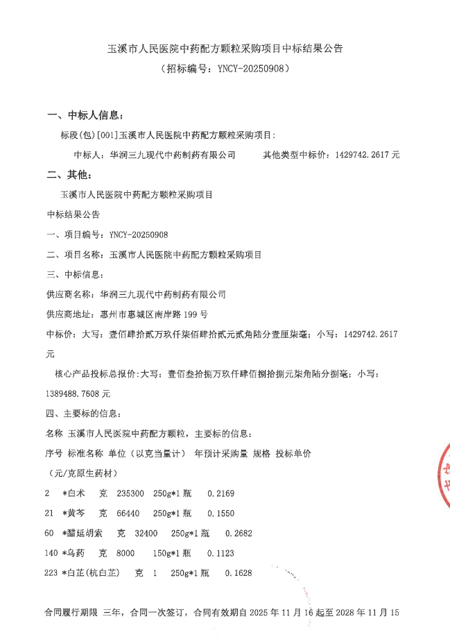 【玉溪市人民医院】云南省玉溪市人民医院中药配方颗粒采购项目中标结果公告