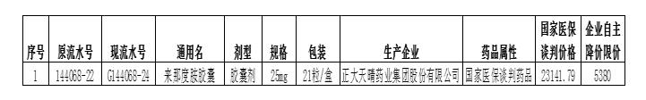 根据企业自主申请,现将正大天晴药业集团股份有限公司 “来那度胺胶囊(25mg *21粒/盒)”纳入“国家医保谈判药品”模块采购,并统一下调省级集采价格(详见下表),请各医疗机构及时下调相关药品价格。
