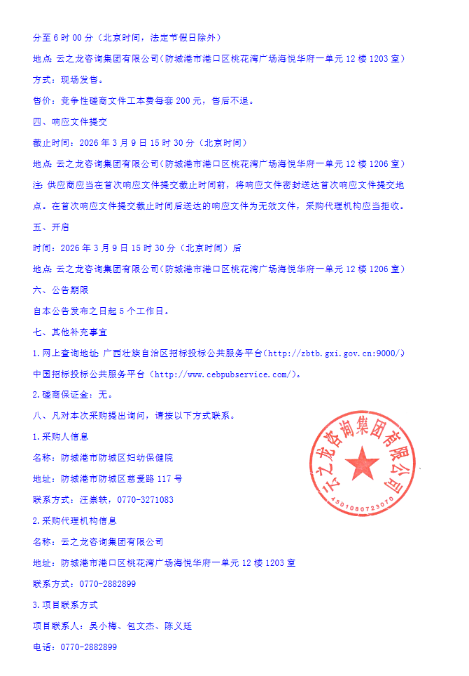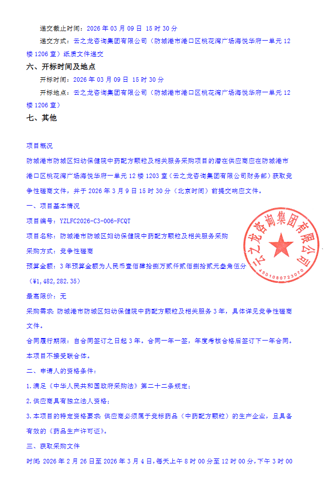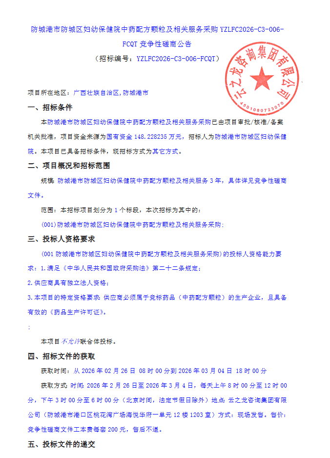 【防城港市防城区妇幼保健院】广西壮族自治区防城港市防城区妇幼保健院中药配方颗粒及相关服务采购YZLFC2026-C3-006-FCQT竞争性磋商公告