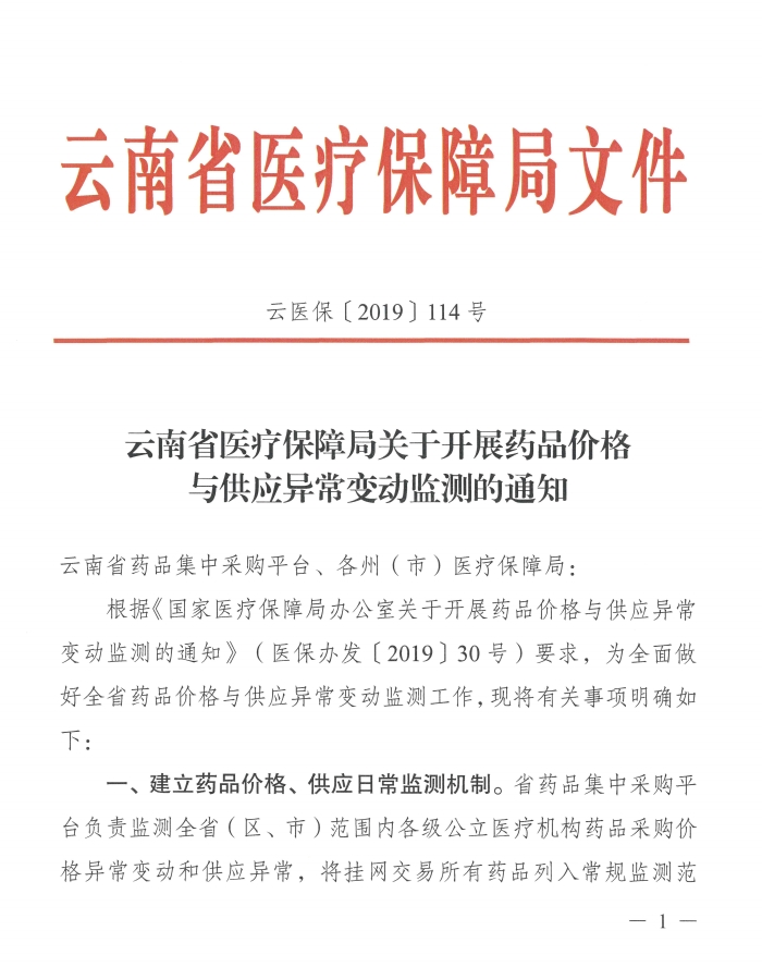 【云南】云南省医保局关于开展药品价格与供应异常变动监测的通知