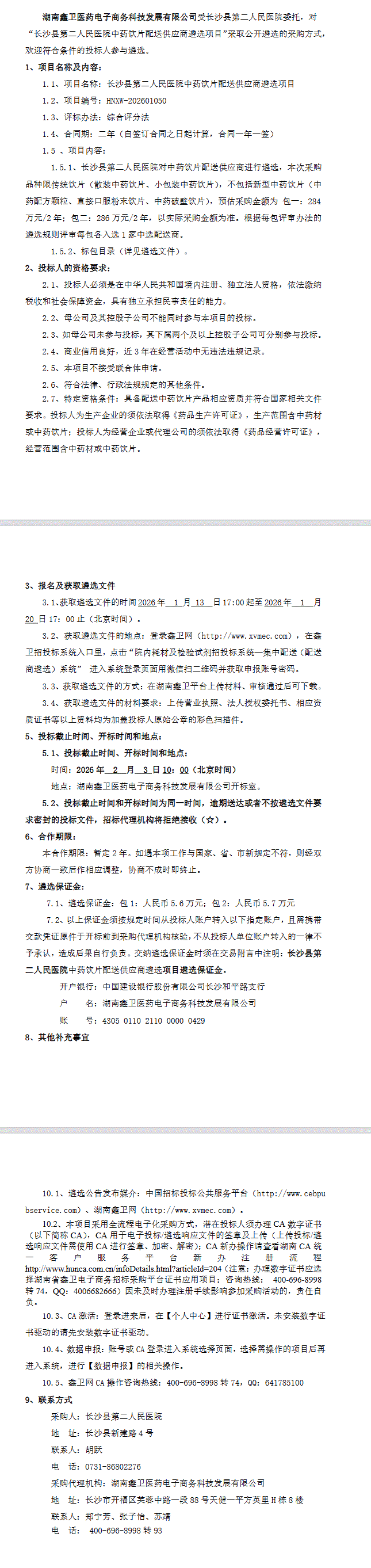 【长沙市长沙县第二人民医院】湖南省长沙市长沙县第二人民医院中药饮片供应商遴选配送项目遴选公告