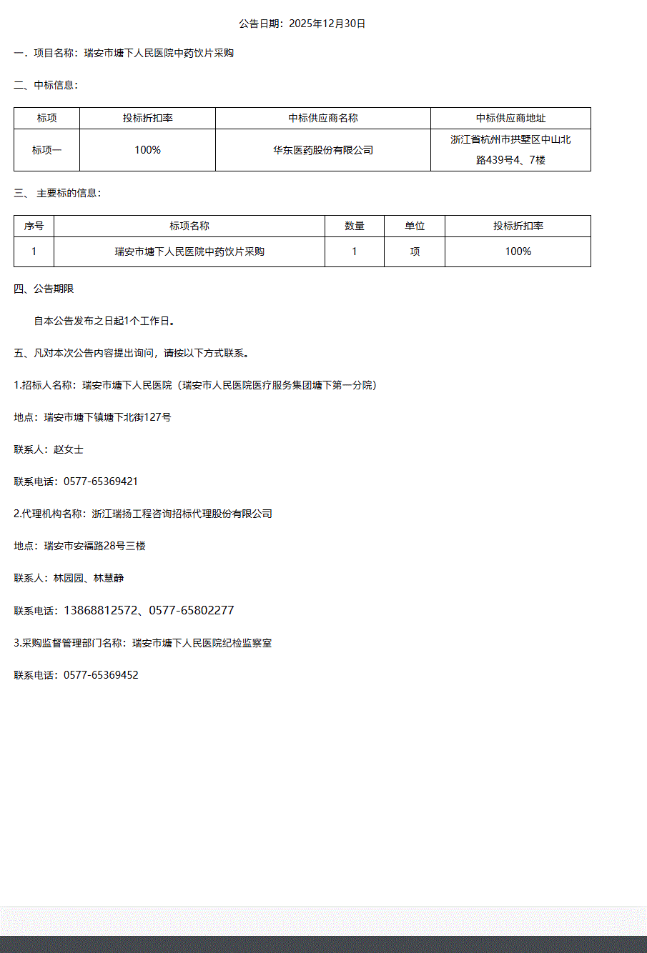 【温州市瑞安市塘下人民医院】浙江省瑞安市塘下人民医院中药饮片采购中标结果公示