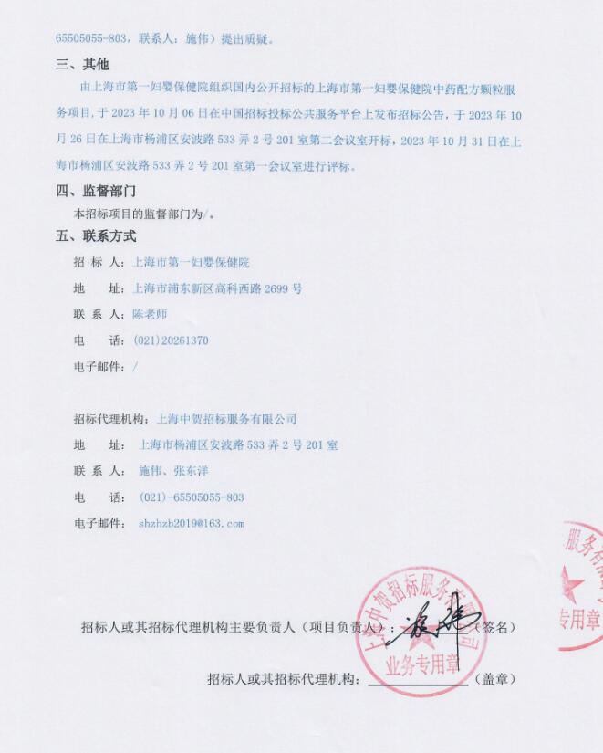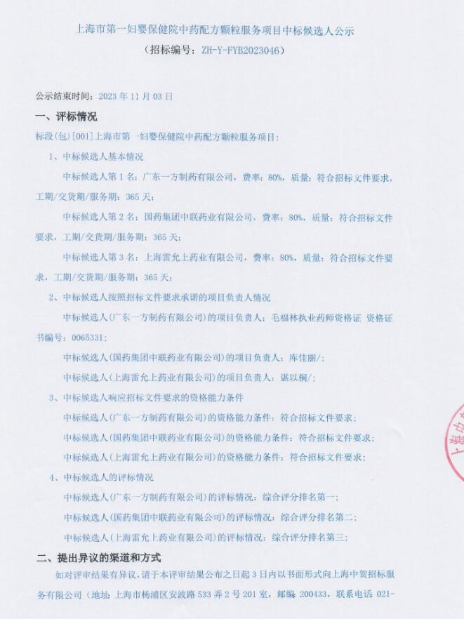 【上海市第一妇婴保健院】上海市第一妇婴保健院中药配方颗粒服务项目中标候选人公示