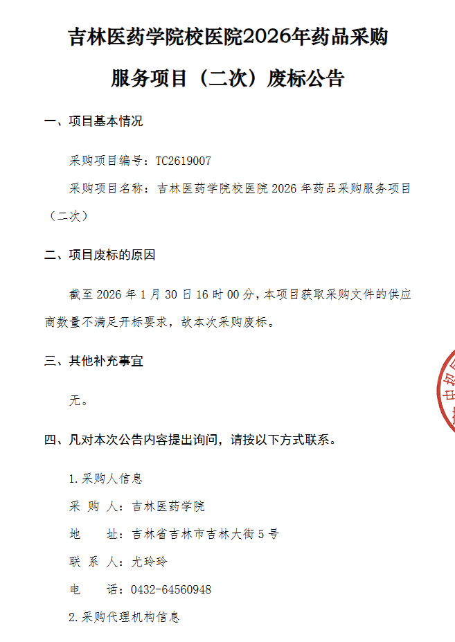 【吉林医药学院】吉林医药学院申请确定药品供应商项目〔重新招标〕-废标公告