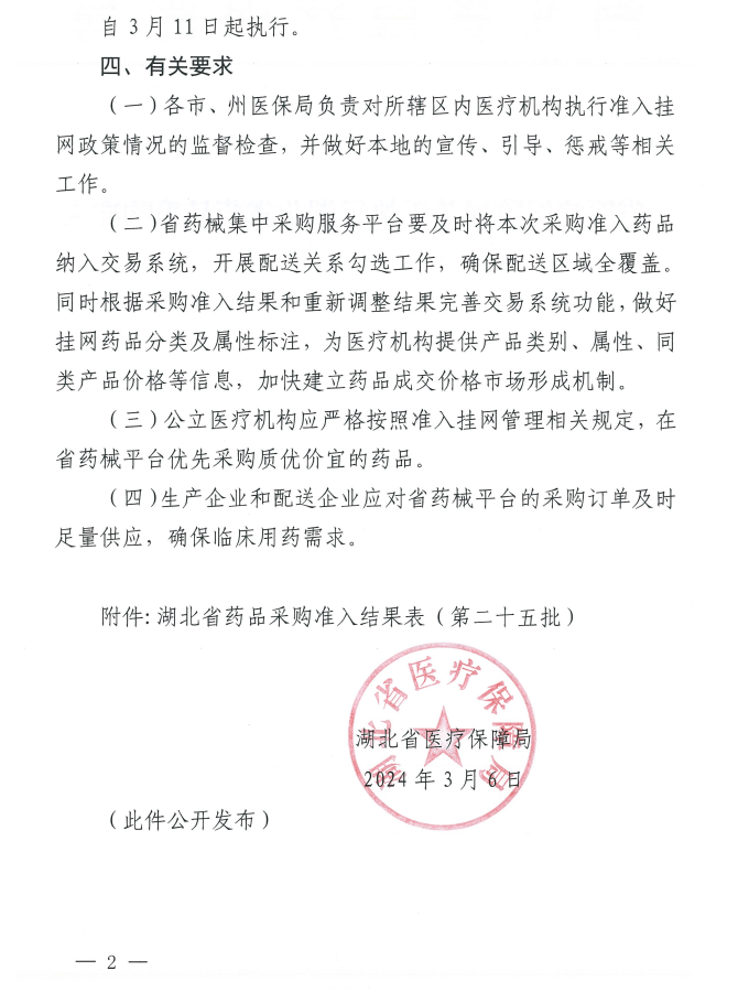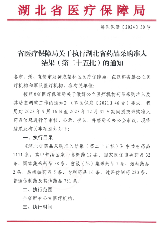 【鄂州】省医保局关于执行湖北省药品采购准入结果(第二十五批)的通知鄂医保函【2024】30号
