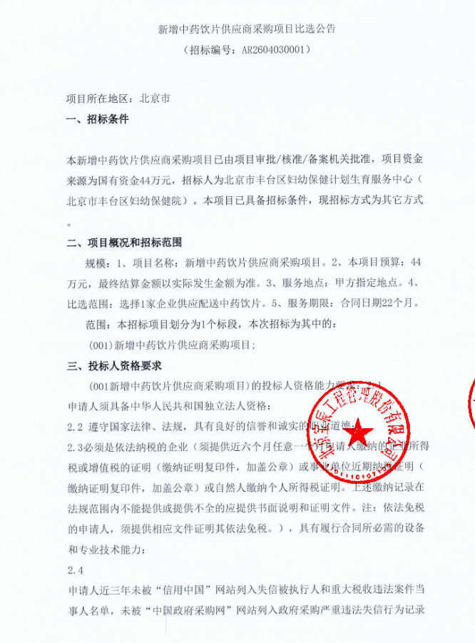 【北京市丰台区妇幼保健计划生育服务中心】北京市丰台区妇幼保健计划生育服务中心(北京市丰台区妇幼保健院)新增中药饮片供应商采购项目比选公告