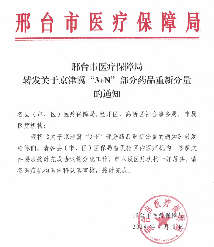 【邢台】邢台市医疗保障局转发关于京津冀“3+N”部分药品重新分量的通知