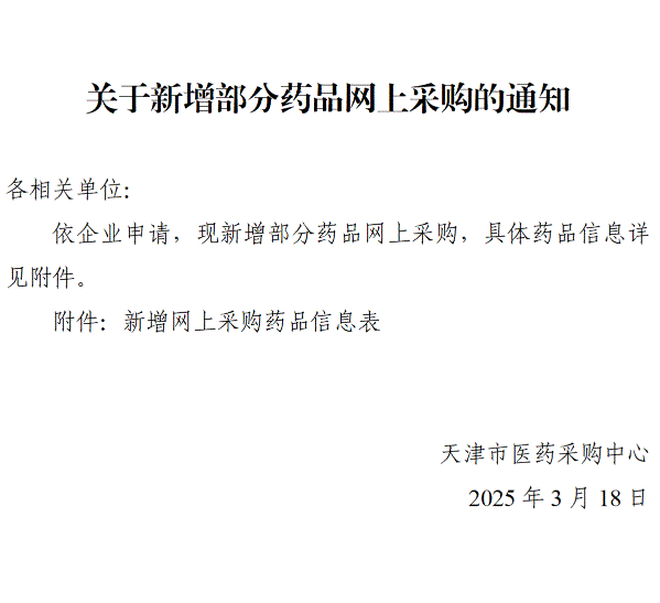 【天津】天津市关于新增部分药品网上采购的通知(20250318)