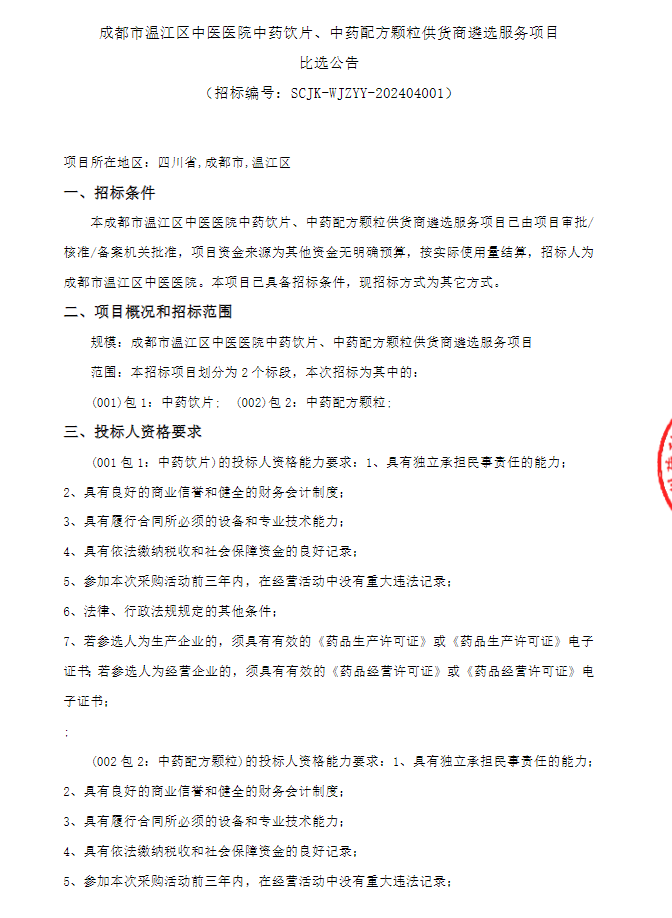 【成都市温江区中医医院】四川省成都市温江区中医医院中药饮片、中药配方颗粒供货商遴选服务项目比选公告