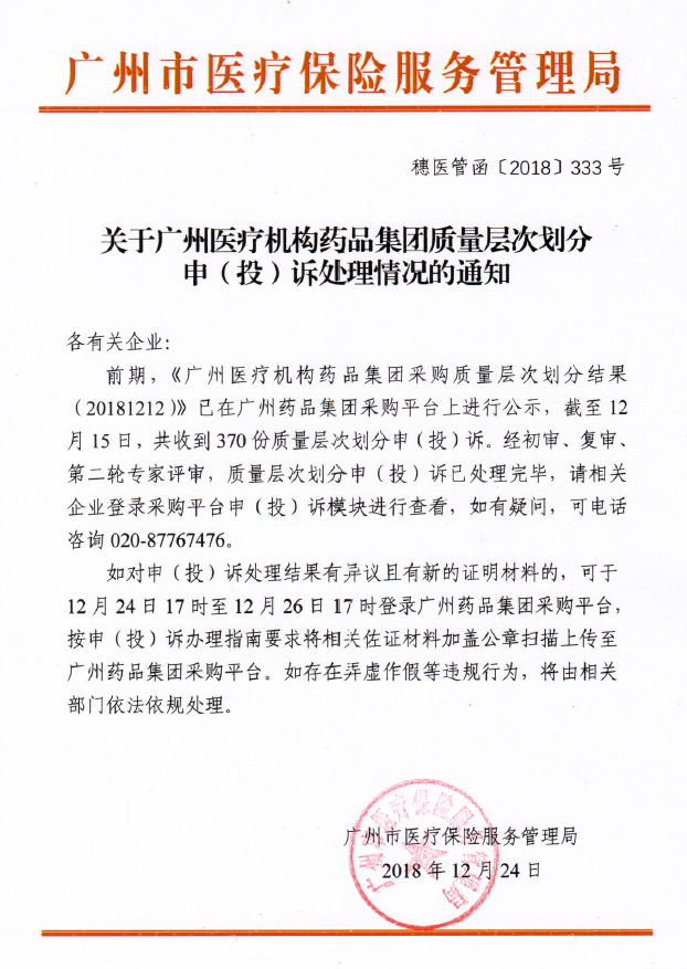【广州】广东省关于广州医疗机构药品集团质量层次划分申(投)诉处理情况的通知