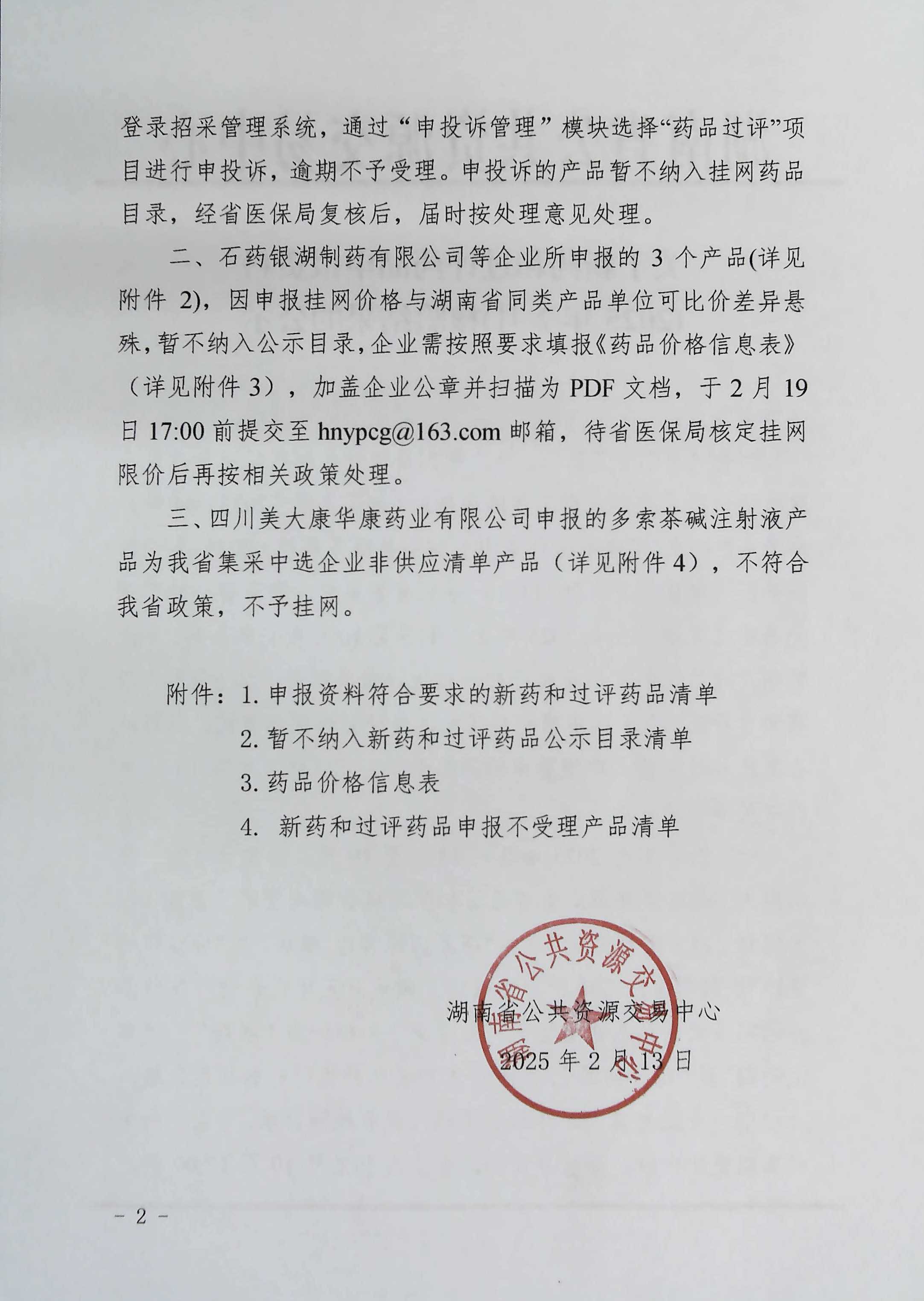 根据《关于规范新药、参比制剂及通过仿制药质量和疗效一致性评价药品挂网采购工作的通知》(湘医保函〔2023〕44号)和《关于印发<湖南省医药集中采购公共服务事项(2024版)>的通知》(湘医保发〔2024〕15号)有关要求,湖南省公共资源交易中心完成了企业2025年2月1日至10日提交的新药、参比制剂及通过仿制药质量和疗效一致性评价类药品(以下简称“新药和过评药品”)的申报资料核验,且经省医保局复核。现将符合新药和过评药品申报要求的药品予以公示(详见附件1),并就有关事项通知如下:
