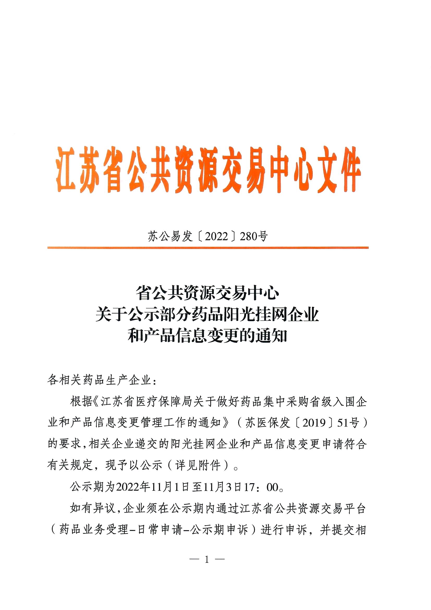 【江苏】省公共资源交易中心关于公示部分药品阳光挂网企业和产品信息变更的通知