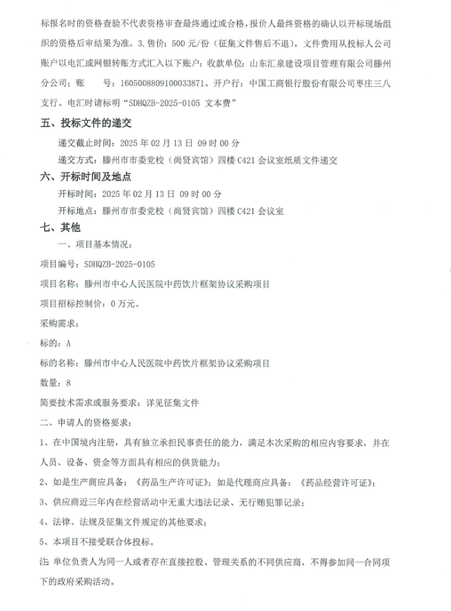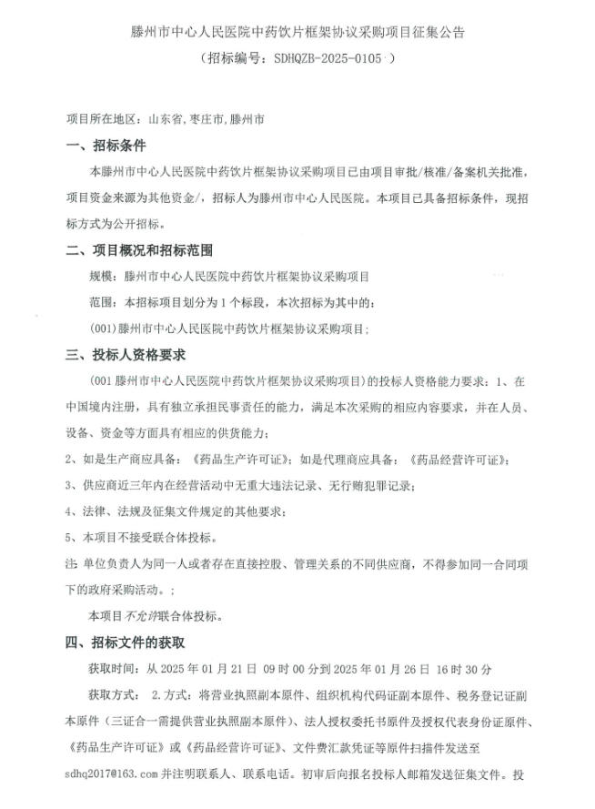 【滕州市中心人民医院】山东省滕州市中心人民医院中药饮片框架协议采购项目征集公告