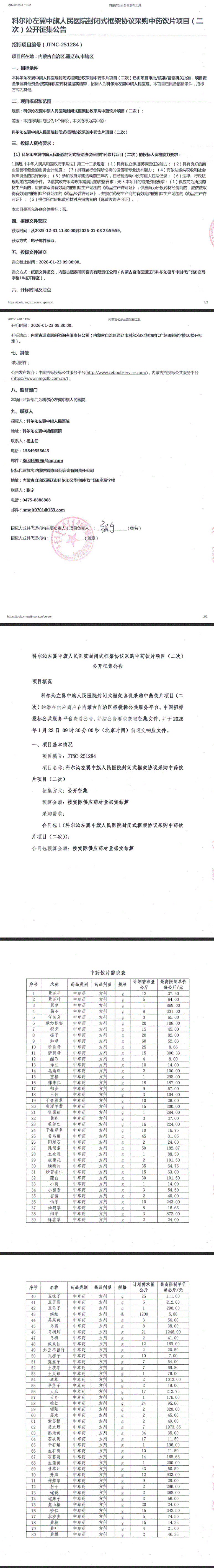 【通辽市科尔沁左翼中旗人民医院】内蒙古自治区通辽市科尔沁左翼中旗人民医院封闭式框架协议采购中药饮片项目(二次)公开征集公告