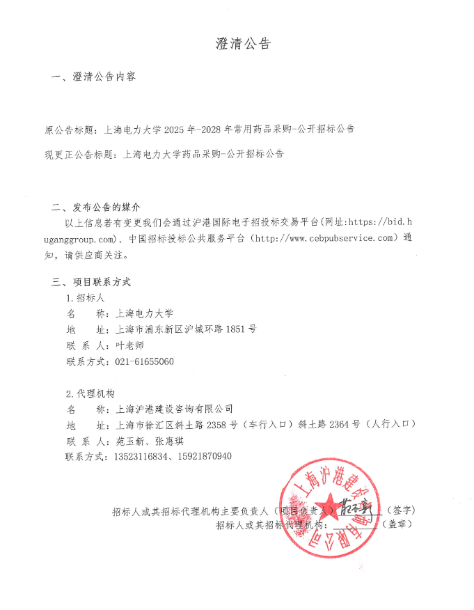 【上海电力大学】上海电力大学2025年-2028年常用药品采购-公开招标公告-澄清公告