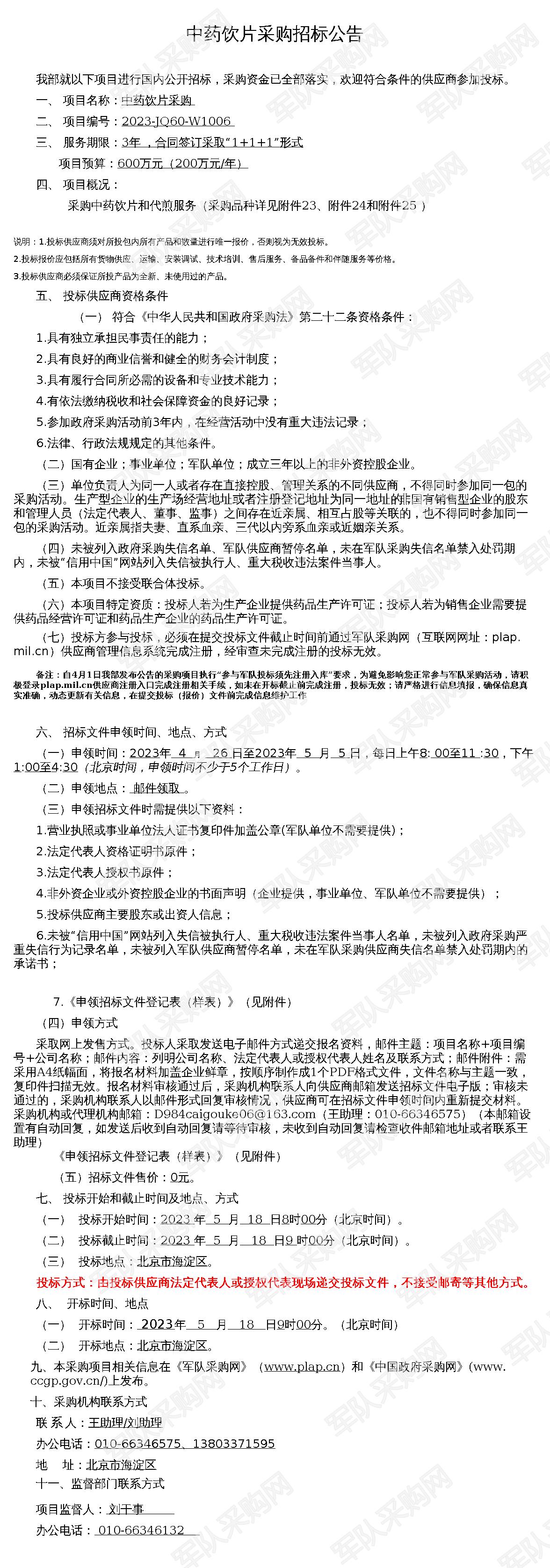 【军队采购】军队采购网中药饮片采购招标公告2023-JQ60-W1006
