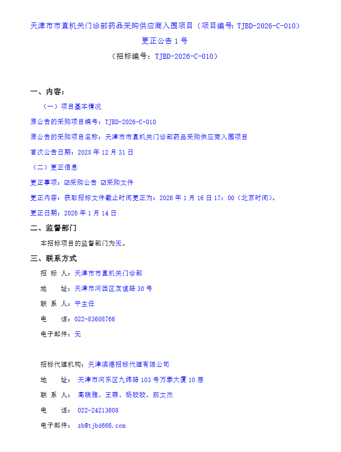 【天津市市直机关门诊部】天津市市直机关门诊部药品采购供应商入围项目(项目编号:TJBD-2026-C-010)更正公告1号