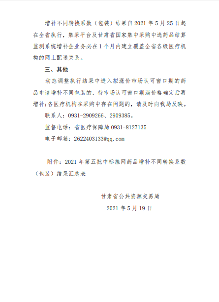 【甘肃】2021年甘肃省关于公布2021年第五批中标挂网药品增补不同转换系数(包装)结果的通知 甘交易医字〔2021〕66号