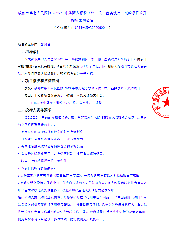 【成都市第七人民医院】四川省成都市第七人民医院2025年中药配方颗粒(块、根、茎类饮片)采购项目公开招标采购公告