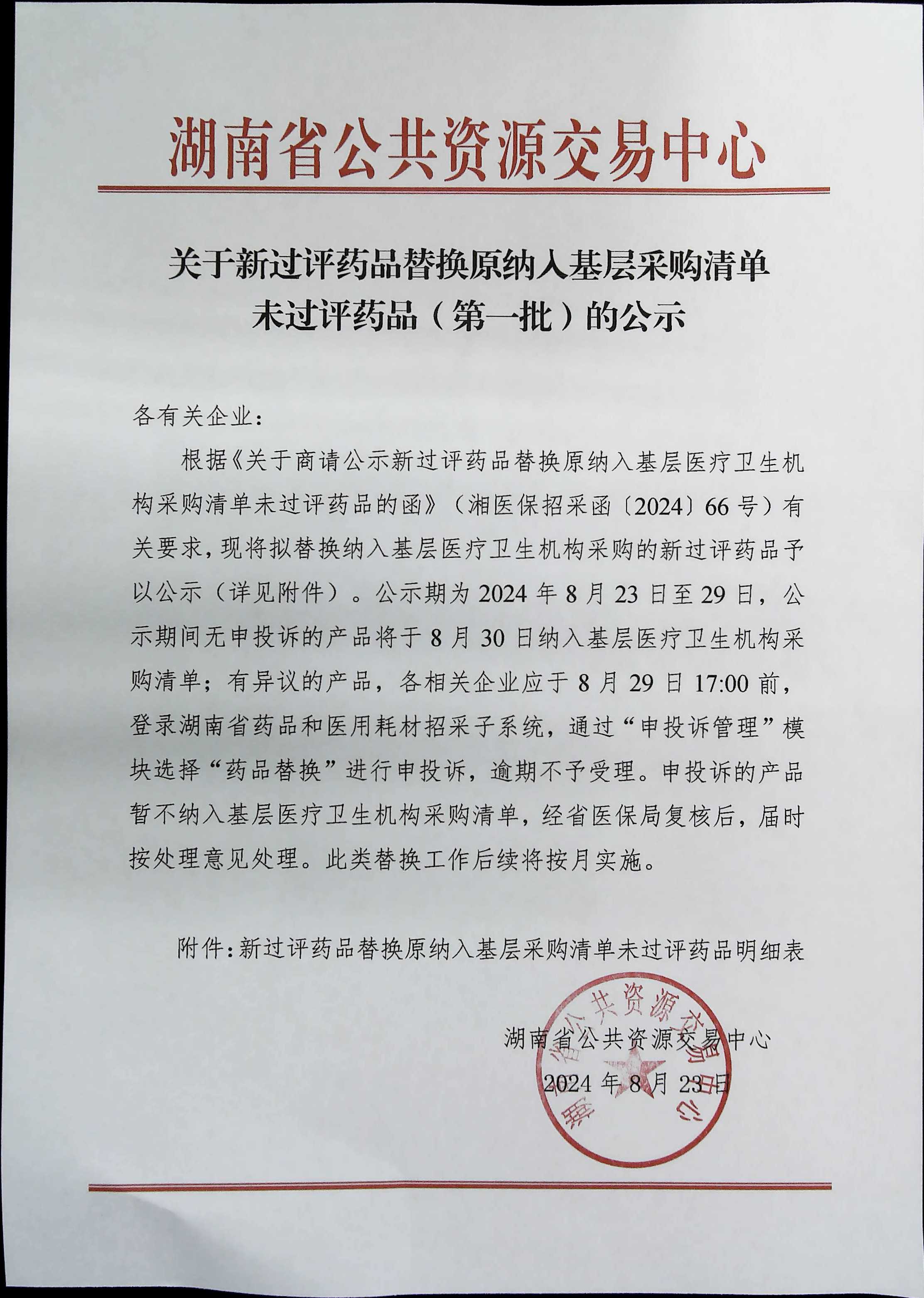 各有关企业: 根据《关于商请公示新过评药品替换原纳入基层医疗卫生机构采购清单未过评药品的函》(湘医保招采函(2024)66号)有关要求,现将拟替换纳入基层医疗卫生机构采购的新过评药品予以公示(详见附件)。公示期为2024年8月23日至29日,公示期间无申投诉的产品将于8月30日纳入基层医疗卫生机构采购清单;有异议的产品,各相关企业应于8月29日17:00前,登录湖南省药品和医用耗材招采子系统,通过“申投诉管理”模块选择“药品替换”进行申投诉,逾期不予受理。申投诉的产品暂不纳入基层医疗卫生机构采购清单,经省医保局复核后,届时按处理意见处理。此类替换工作后续将按月实施。