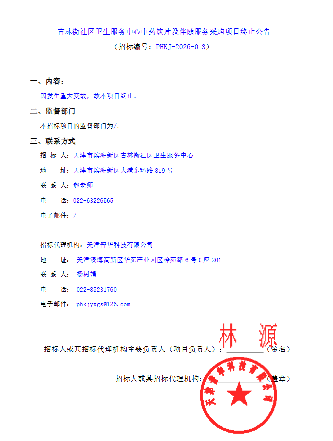 【天津市古林街社区卫生服务中心】天津市古林街社区卫生服务中心中药饮片及伴随服务采购项目终止公告