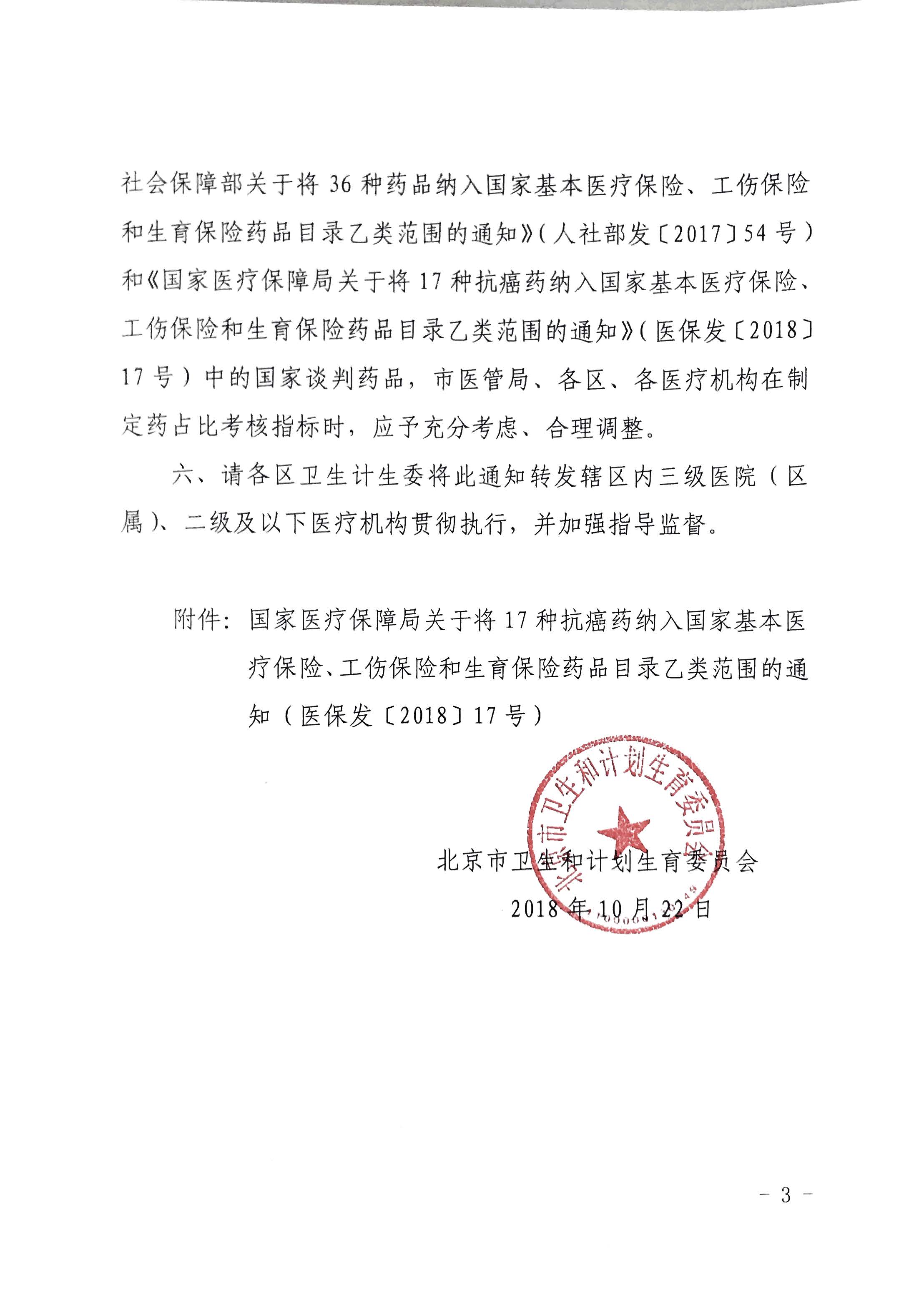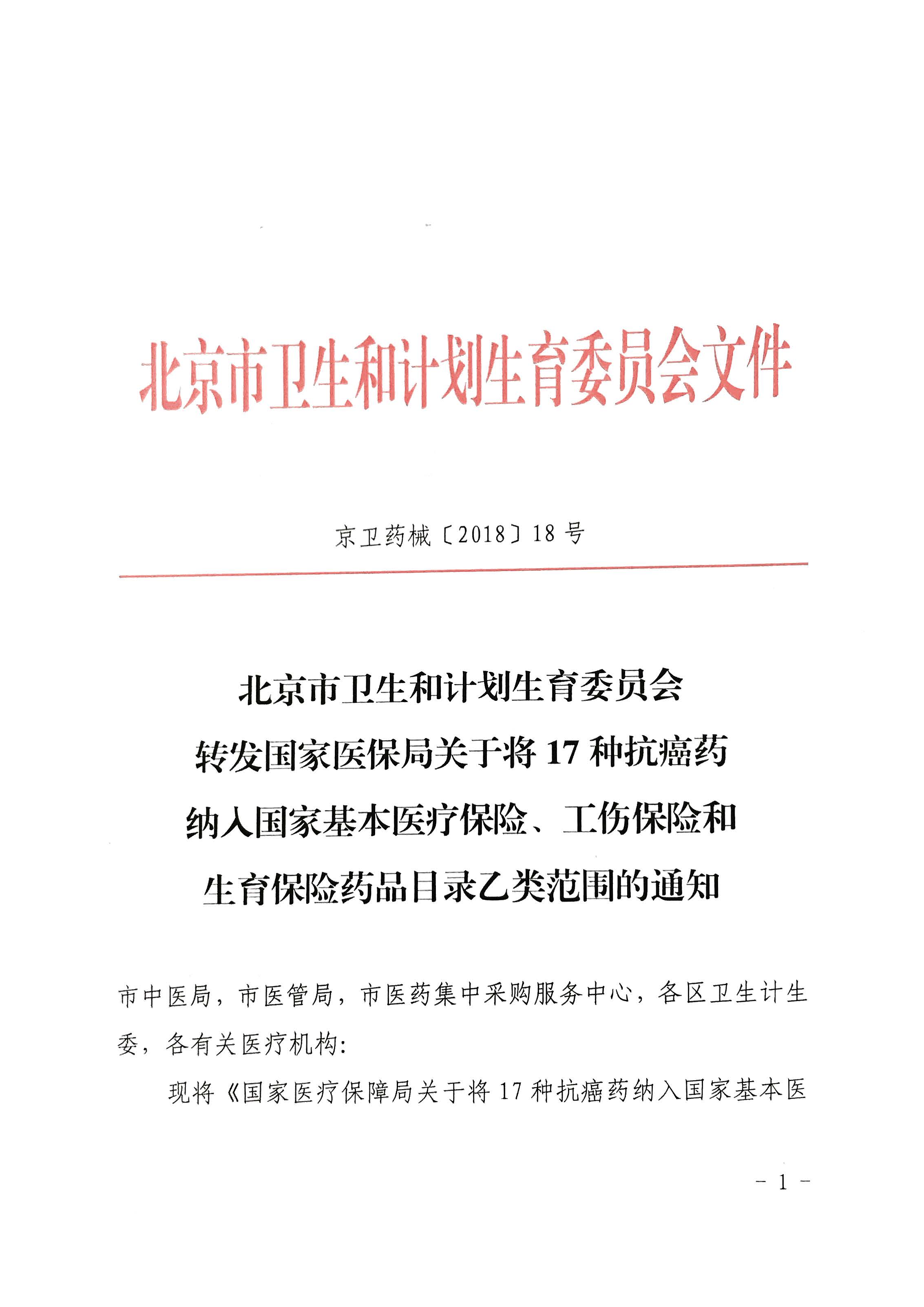【北京】北京市卫计委关于转发国家医疗保障局关于将17种抗癌药纳入国家基本医疗保险、工伤保险和生育保险药品目录乙类范围的通知