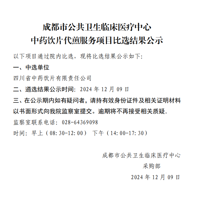 【成都市公共卫生临床医疗中心】四川省成都市公共卫生临床医疗中心中药饮片代煎服务采购项目结果公示