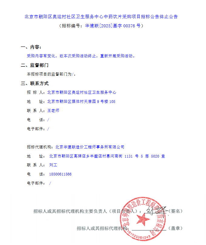 【北京市朝阳区奥运村社区卫生服务中心】北京市朝阳区奥运村社区卫生服务中心中药饮片采购项目招标公告终止公告