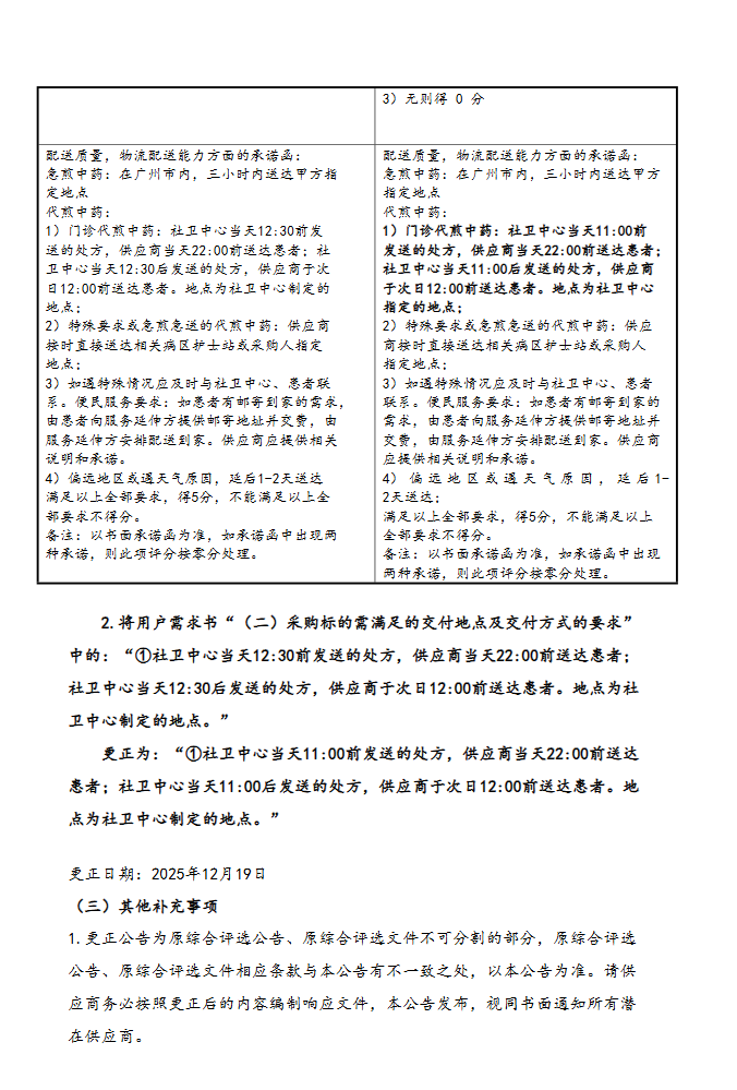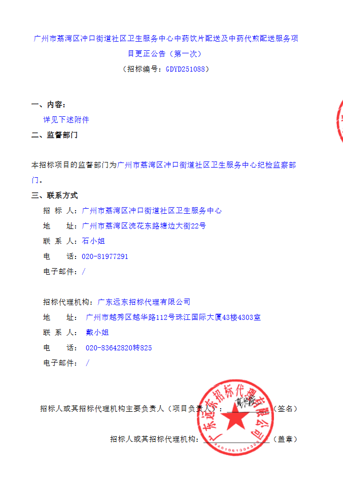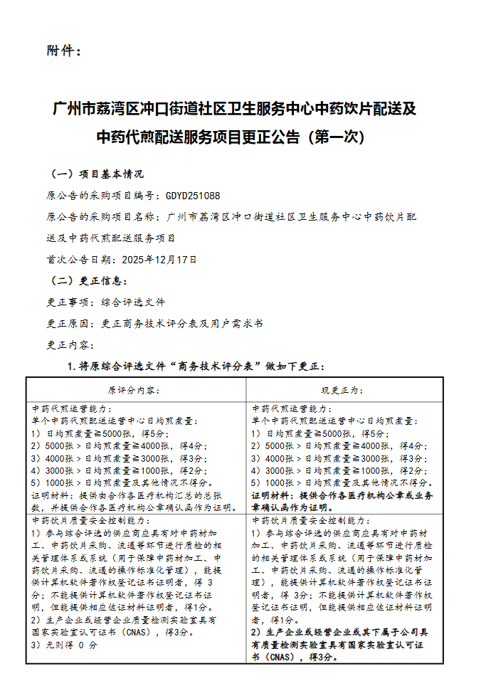 【广州市荔湾区冲口街道社区卫生服务中心】广东省广州市荔湾区冲口街道社区卫生服务中心中药饮片配送及中药代煎配送服务项目更正公告(第一次)
