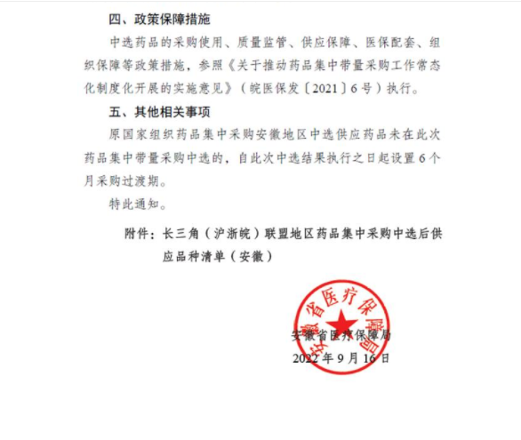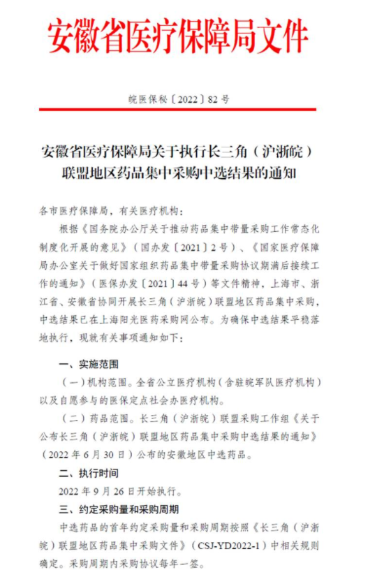 现将《安徽省医疗保障局关于执行长三角(沪浙皖)联盟地区药品集中采购中选结果的通知》(皖医保秘〔2022〕82号)转发给你们,请严格按照通知要求,认真贯彻落实。