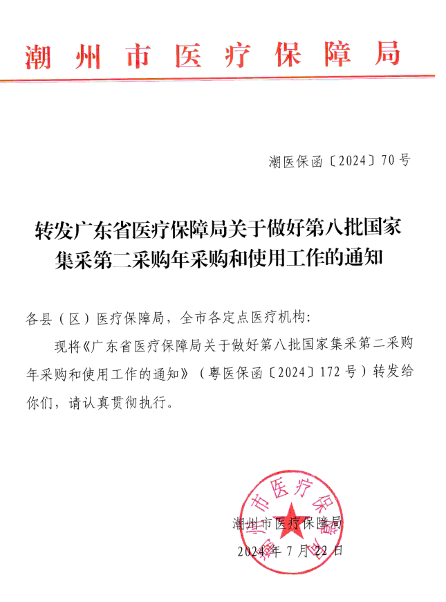 【潮州】潮医保函〔2024〕70号 转发广东省医疗保障局关于做好第八批国家集采第二采购年采购和使用工作的通知
