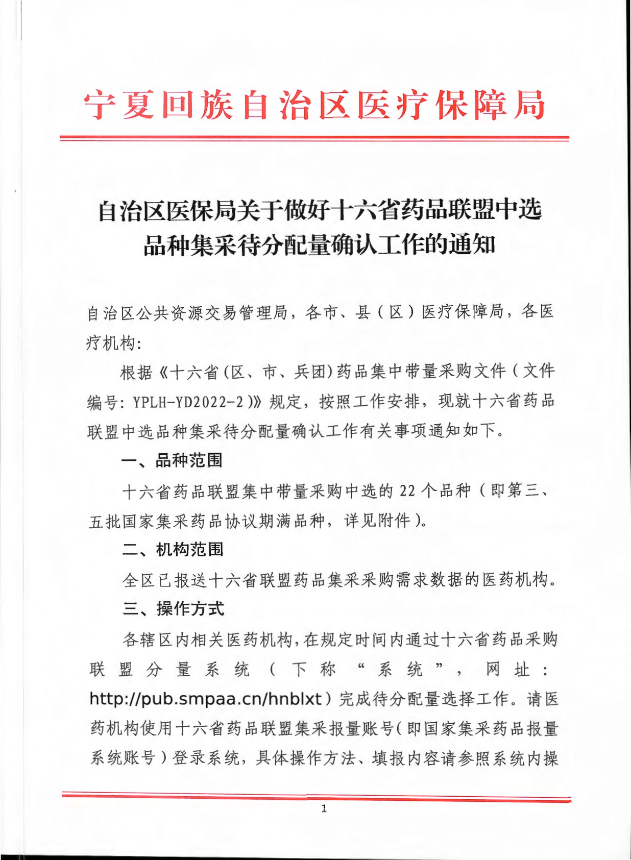 根据《十六省(区、市、兵团)药品集中带量采购文件(文件编号:YPLH-YD2022-2)》规定,按照工作安排,现就十六省药品联盟中选品种集采待分配量确认工作有关事项通知如下。