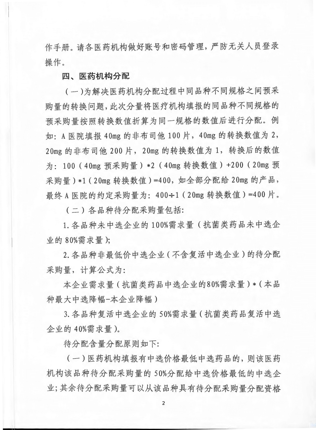 (一)为解决医药机构分配过程中同品种不同规格之间预采购量的转换问题,此次分量将医疗机构填报的同品种不同规格的预采购量按照转换数值折算为同一规格的数值后进行分配。例如:A医院填报40mg的非布司他100片,40mg的转换数值为2,20mg的非布司他200片,20mg的转换数值为1,转换后的数值为:100(40mg预采购量)*2(40mg转换数值)+200(20mg预采购量)*1(20mg转换数值)=400,如全部分配给20mg的产品,最终A医院的约定采购量为:400÷1(20mg转换数值)=400片。