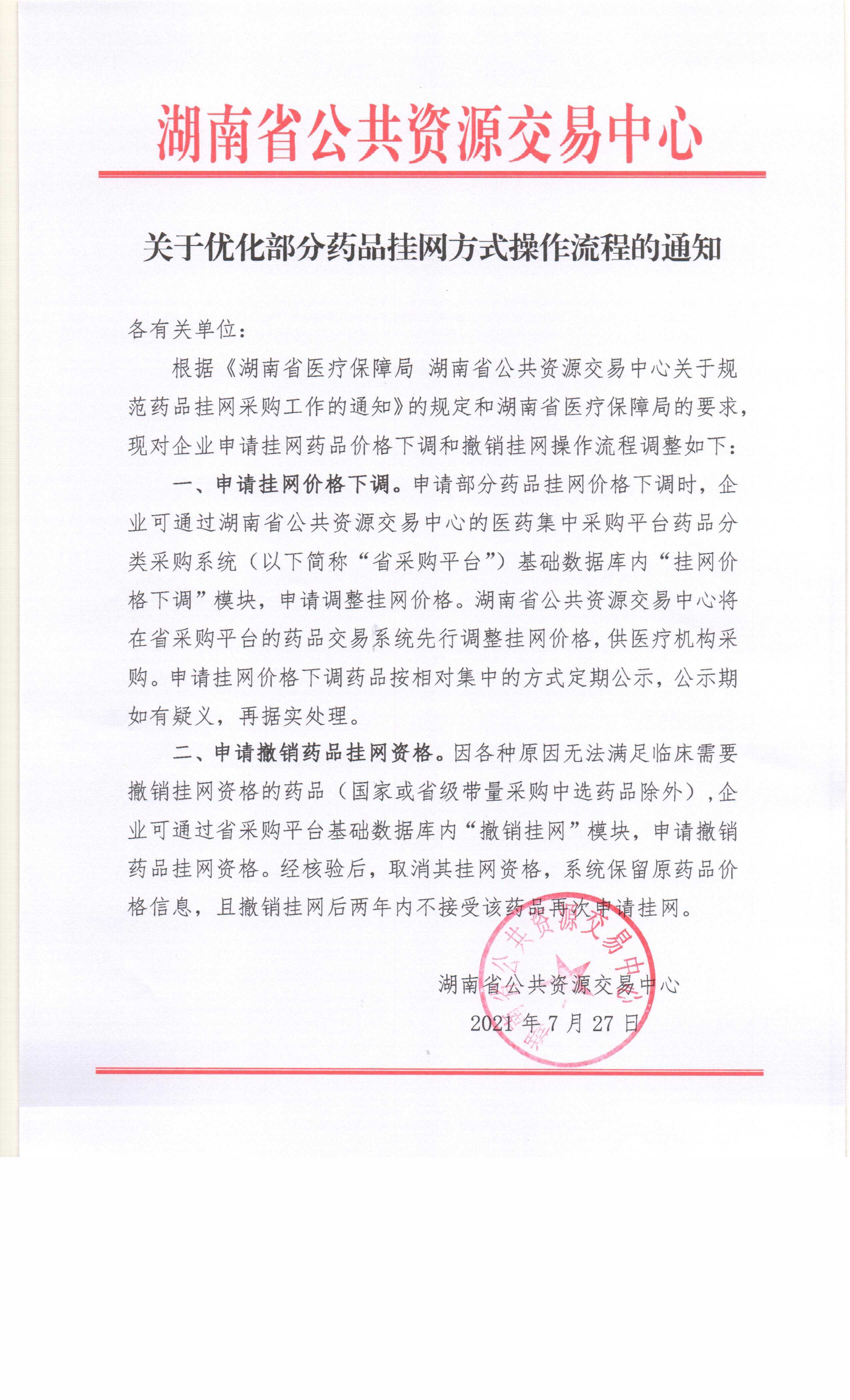 【湖南】2021年湖南省关于优化部分药品挂网方式操作流程的通知