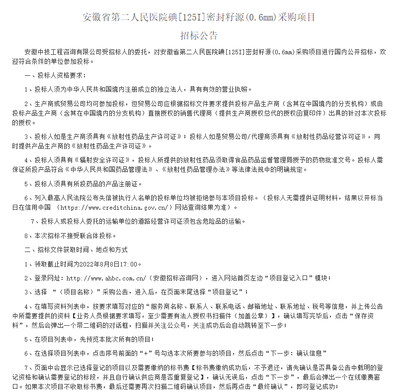【安徽省第二人民医院】安徽省第二人民医院碘〔125I〕密封籽源(0.6mm)采购项目招标公告
