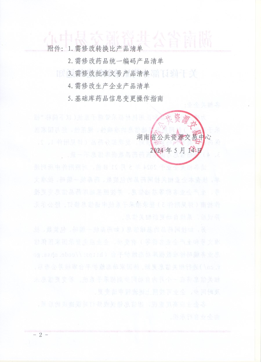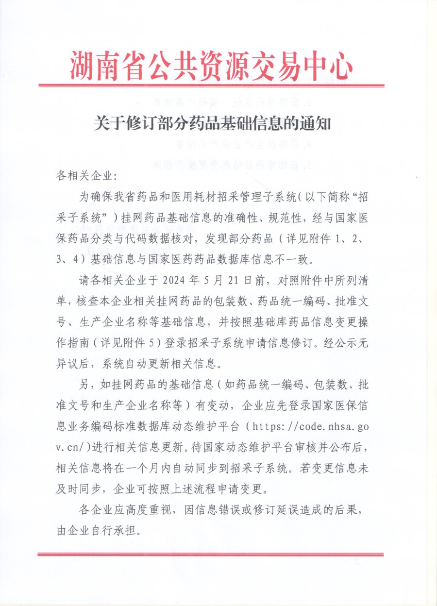 请各相关企业于2024年5月21日前,对照附件中所列清单,核查本企业相关挂网药品的包装数、药品统一编码、批准文号、生产企业名称等基础信息,并按照基础库药品信息变更操作指南(详见附件5)登录招采子系统申请信息修订。经公示无异议后,系统自动更新相关信息。