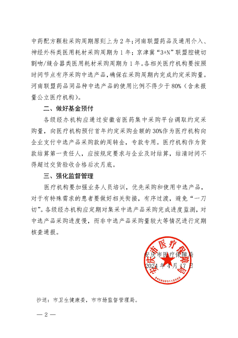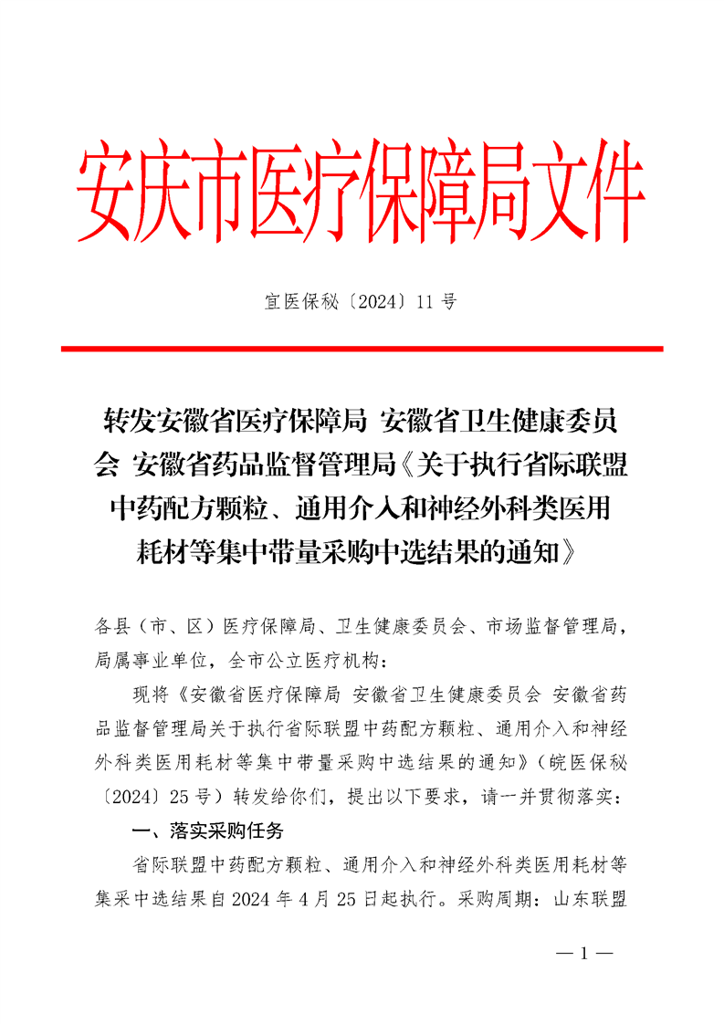【安庆】转发安徽省医疗保障局安徽省卫生健康委员会安徽省药品监督管理局《关于执行省际联盟中药配方颗粒、通用介入和神经外科类医用耗材等集中带量采购中选结果的通知》宜医保秘〔2024〕11 号