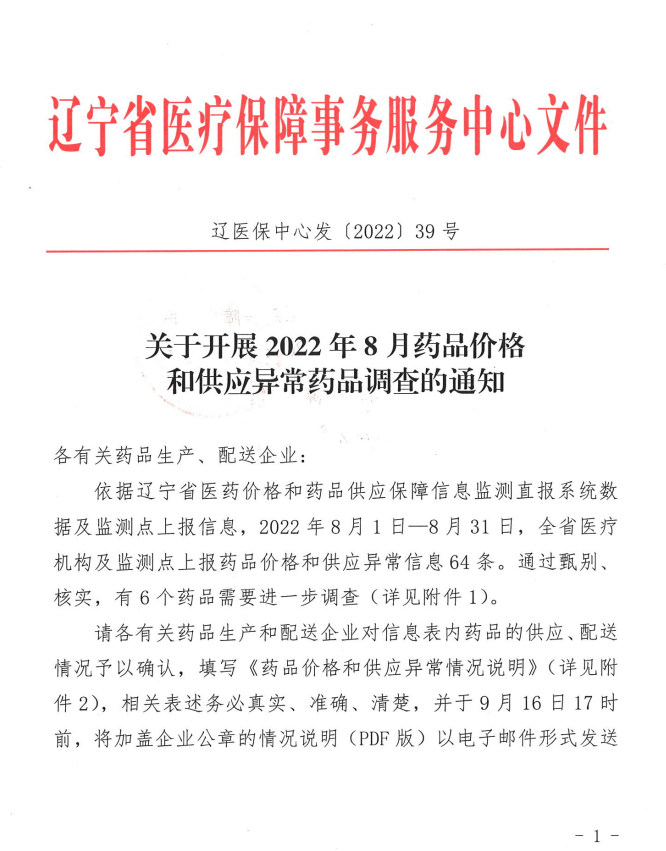 【辽宁】辽宁省关于开展2022年8月药品价格和供应异常药品调查的通知