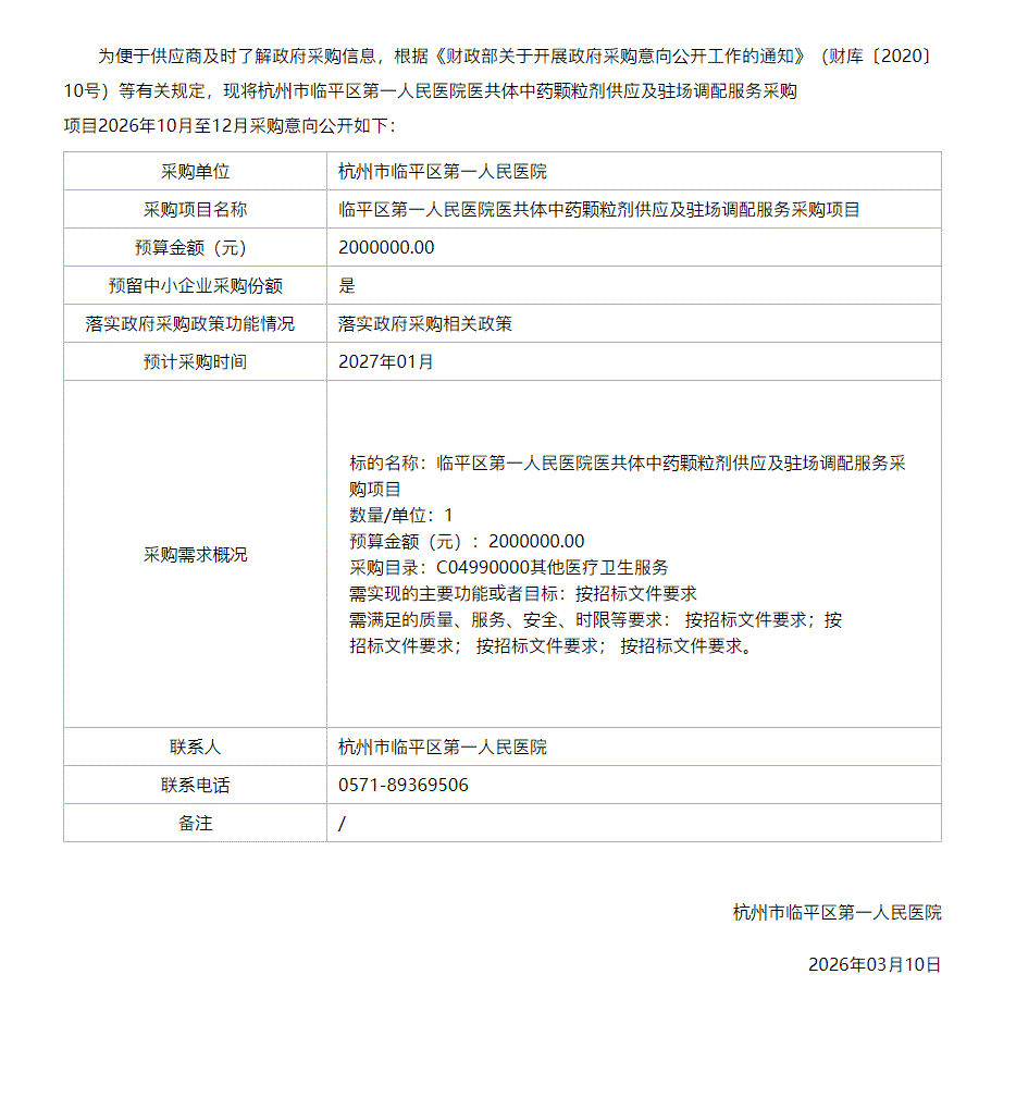 【杭州市临平区第一人民医院】浙江省杭州市临平区第一人民医院医共体中药颗粒剂供应及驻场调配服务采购项目2026年10月至12月政府采购意向