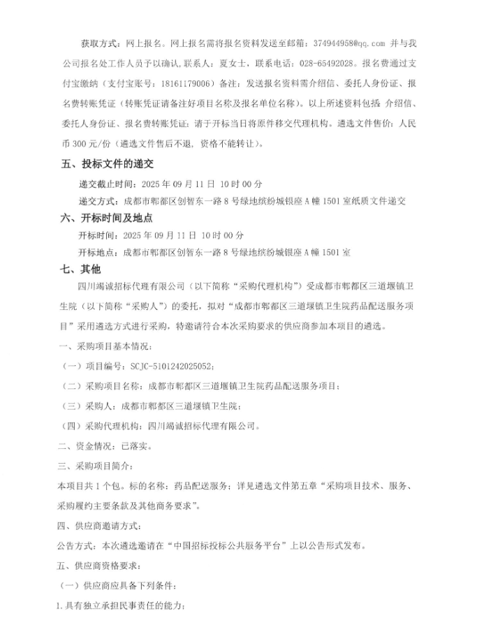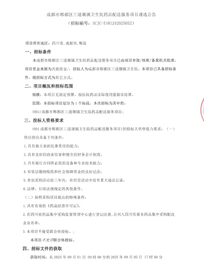 【成都市郫都区三道堰镇卫生院】四川省成都市郫都区三道堰镇卫生院药品配送服务项目遴选公告