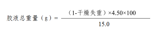 附:黏度 取本品4.50g,置已称定重量的100ml烧杯中,加温水20ml,置60℃水浴中搅拌使溶化;取出烧杯,擦干外壁,加水使胶液总重量达到下列计算式的重量(含干燥品15.0%),将胶液搅匀后倒入干燥的具塞锥形瓶中,密塞,置40℃±0.1℃水浴中,当胶液的温度达到40℃±0.1℃后,移至平氏黏度计内,照黏度测定法(通则0633第一法,毛细管内径为2.0mm),于40℃±0.1℃水浴中测定。