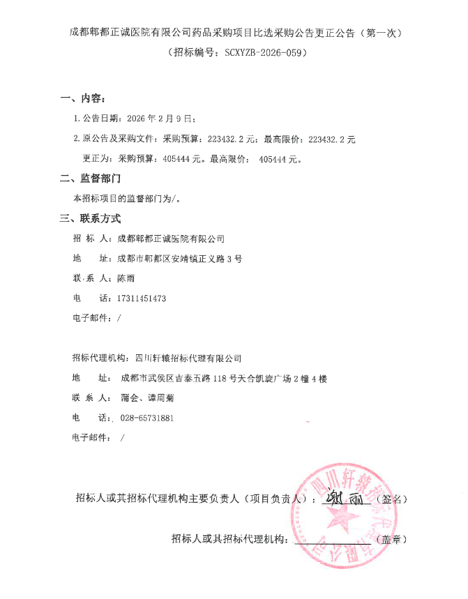 【成都郫都正诚医院】四川省成都郫都正诚医院有限公司药品采购项目比选采购公告更正公告(第一次)