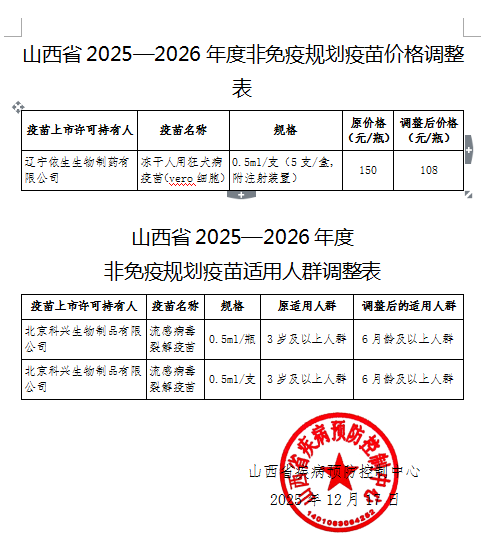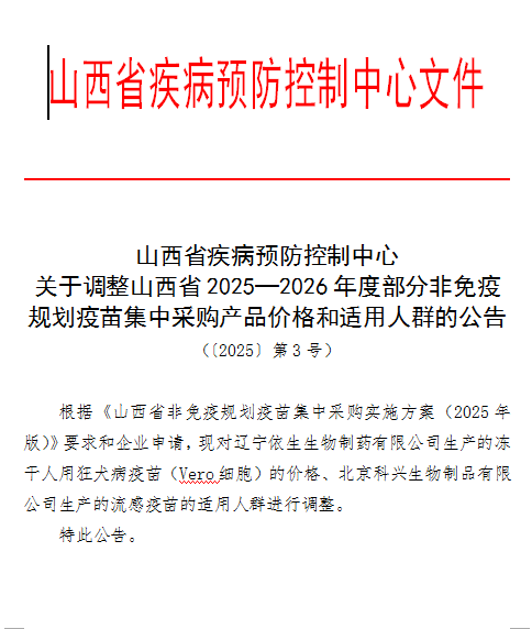 【山西】关于调整山西省2025-2026年度部分非免疫规划疫苗集中采购产品价格和适用人群的公告