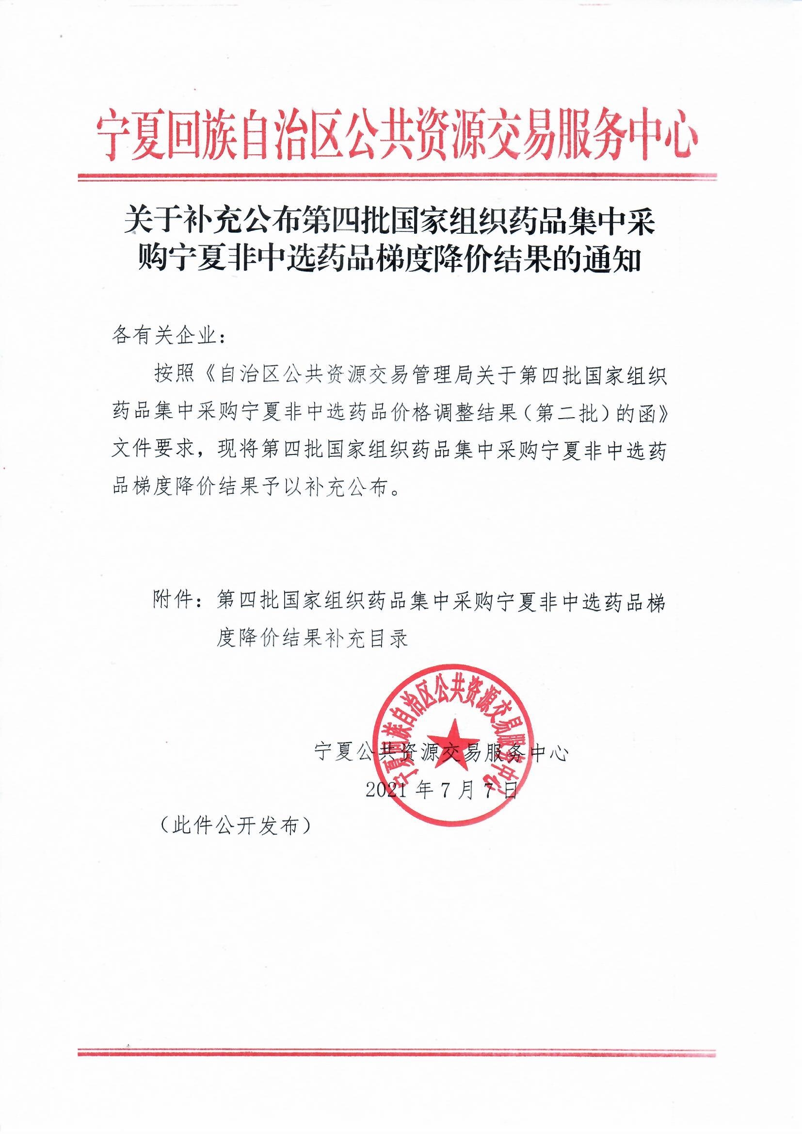 【宁夏】2021年宁夏自治区关于补充公布第四批国家组织药品集中采购宁夏非中选药品梯度降价结果的通知