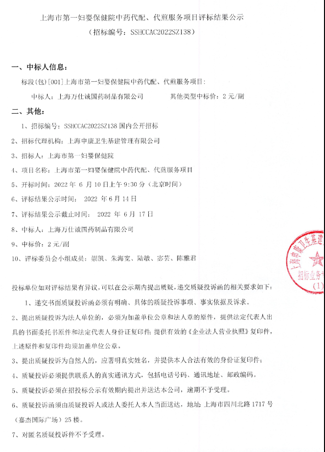【上海市第一妇婴保健院】上海市第一妇婴保健院中药代配、代煎服务评标结果公示